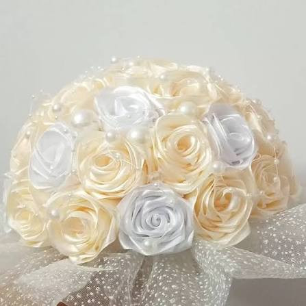 دسته گل عروس رز روبانی با تزیینات مروارید و تور