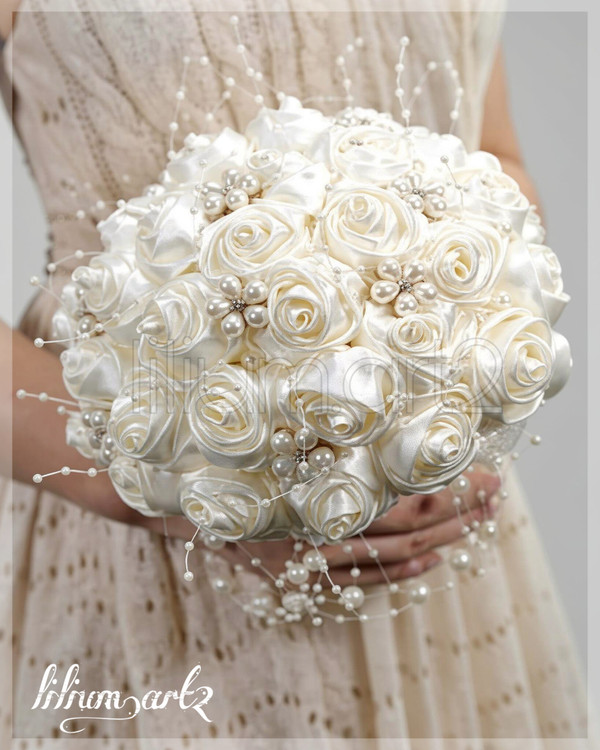 دسته گل رز روبانی با تزیینات مروارید برای مراسم عقد عروسی نامزدی بله برون