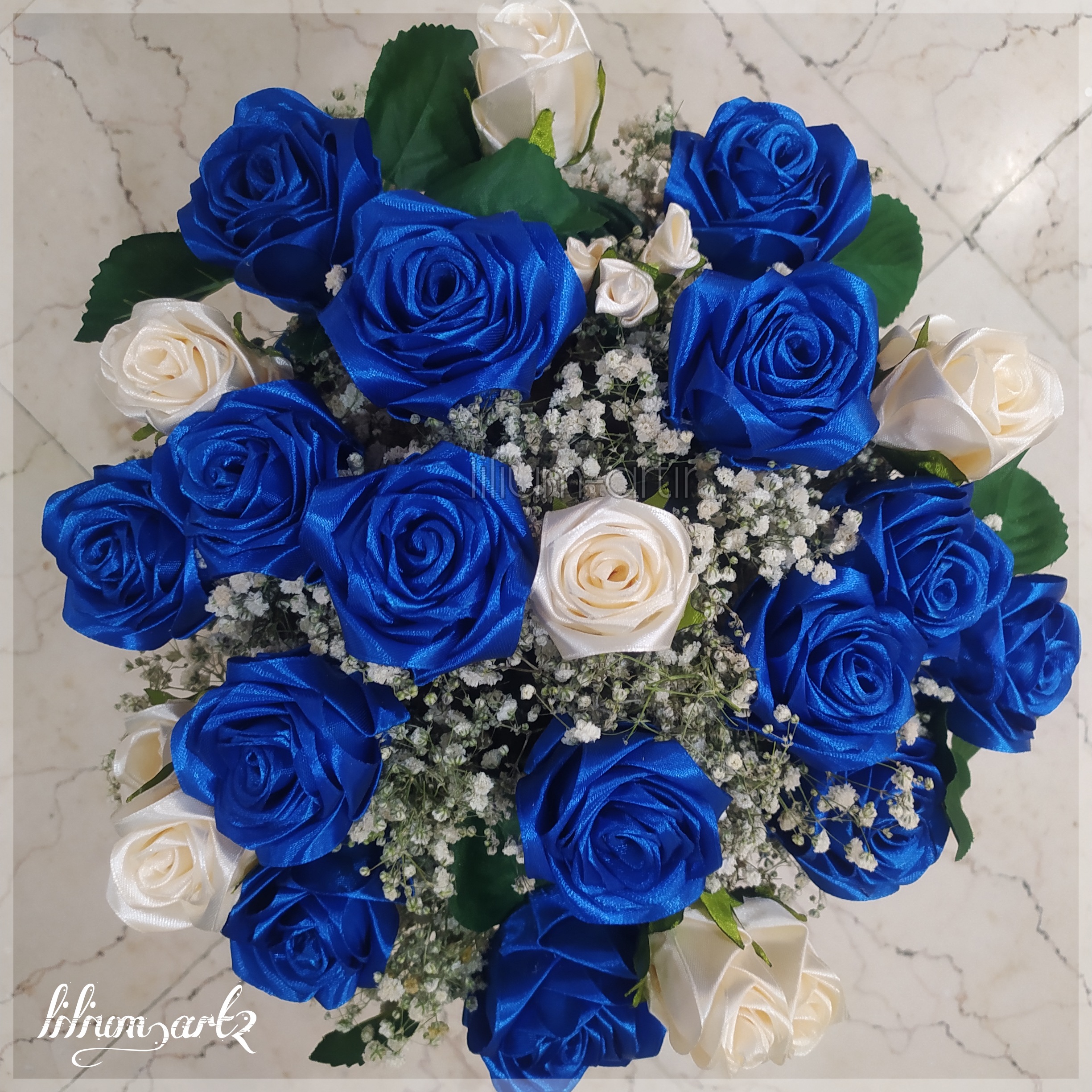 ۲۸ شاخه رز روبانی vip آبی سرمه ای و شیری زیبا مناسب برای هدیه و کادو